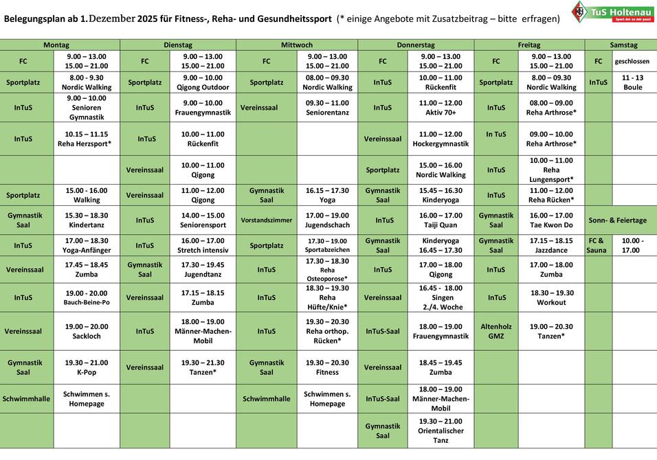 Belegungsplan für Fitness-, Reha- und Gesundheitssport Dezember 2025