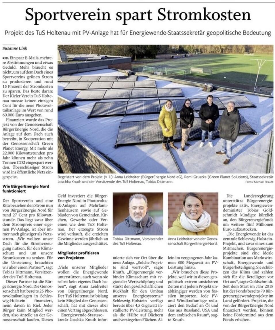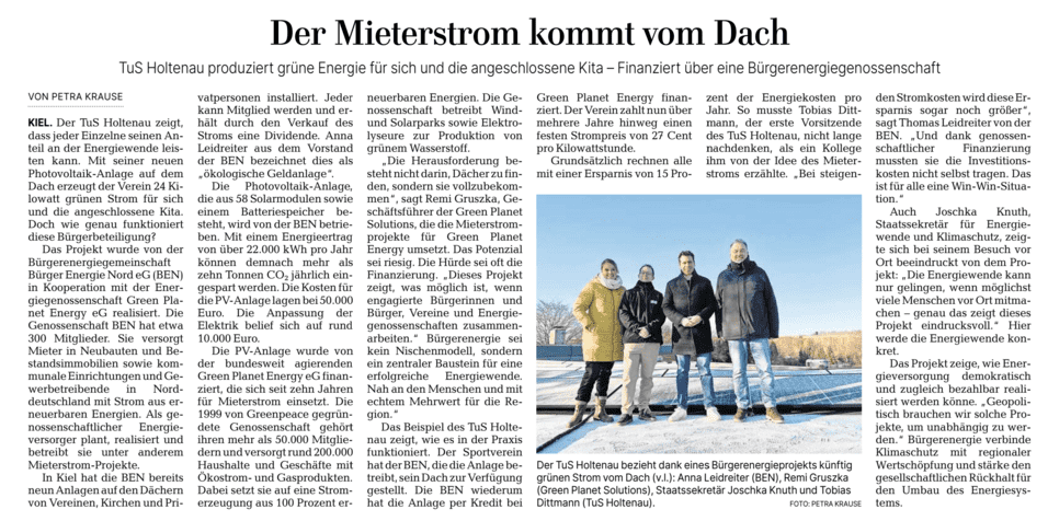Bereits seit Ende November 2025 beziehen wir klimafreundlichen, grünen Strom von der eigenen PV-Anlage auf dem Dach des Vereinsgebäudes. Ermöglicht haben dies die Projekpartner von "BürgerenergieNord eG" und "Green Planet Solutions". Herzlichen Dank!!